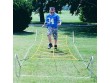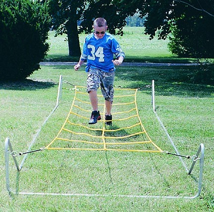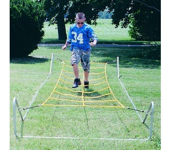 This knee high trainer frame is made from 1" galvanized steel tubing. It is designed for the comfort of the player with cross braces only at the ends. This eliminates the chance of a player stepping on the middle cross braces while running through the ropes. Frame is 17 feet long and 5 feet wide. Ropes can be adjusted to 19 inches high. To order replacement ropes, click here.