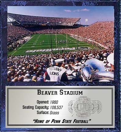 Beaver Stadium, home to the Penn State Nittany Lions, has many great memories and traditions. Ready to hang, this 12x15 black marble finished plaque comes with an 8x10 photo and a silver satin plate displaying the field seating chart and stadium dimensions. A great gift for all NCAA fans!