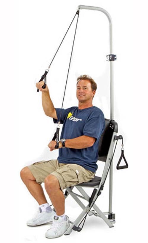 The Freedom Flex accessory attaches easily and securely to the back of The Resistance Chair® System. The Freedom Flex shoulder stretcher offers a convenient and effective way to maintain flexibility in your shoulders. The vertical support pole consists of an upper and lower half, which swivel at the center connection point for greater range of motion. When not in use, the top half of the support pole can be rotated to the side or detached.