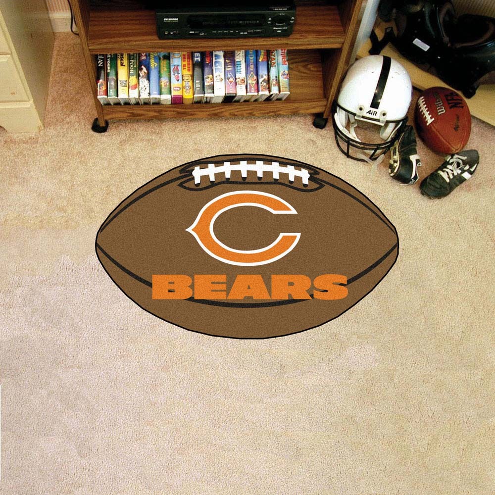 For all those Chicago Bears Fans out there: football-shaped area rugs by FANMATS! Made in the U.S.A. 100% nylon carpet and non-skid Duragon®: latex backing. Machine washable. Officially NFL licensed. Chromojet painted in true team colors.