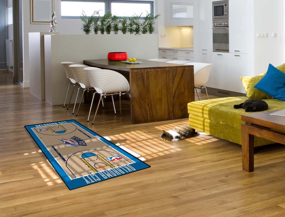 Support your favorite NBA team with these basketball court-shaped runners by FANMATS. Made in U.S.A. 100% nylon carpet and non-skid Duragon® latex backing. Machine washable. Officially licensed. Chromojet painted in true Oklahoma City Thunder colors.