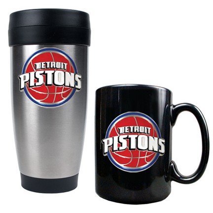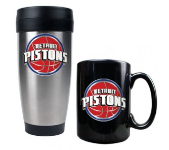 You can drink coffee on the road as well as in your home or office with this officially NBA licensed stainless steel travel mug and ceramic mug combo-set. Both are decorated with a hand-crafted metal Detroit Pistons logo.
