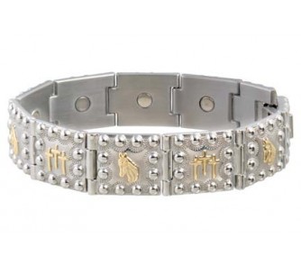 Sporting the bold western look, this bracelet features three crosses and a horse head in alternating links. The two tone polished stainless and gold accents make this design a great one! A 1200 gauss samarium cobalt magnet is in each large link.