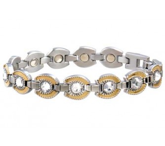 Two tone gold plating and polished stainless designs always make a great combination! Bright and clear cubic zirconia gems set in attractive horseshoe design links with gold accents make this bracelet a beautiful addition to your collection. A 1200 gauss magnet is each link.