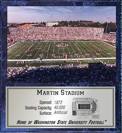 Martin Stadium, home of the Washington State Cougars, has many great memories and traditions. Ready to hang, this 12x15 black marble finished plaque comes with an 8x10 photo and a silver satin plate displaying the field seating chart and stadium dimensions. A great gift for all NCAA fans!