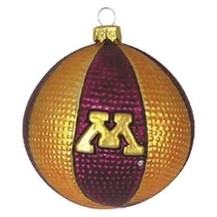Mouth-blown glass, authentic hand-painted NCAA basketball displaying the Minnesota Golden Gophers logo and colors.
