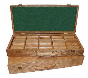 This beautiful OAK chip carrying case holds 500 casino chips. There are five individual 100 chip trays that are removable from the master case.