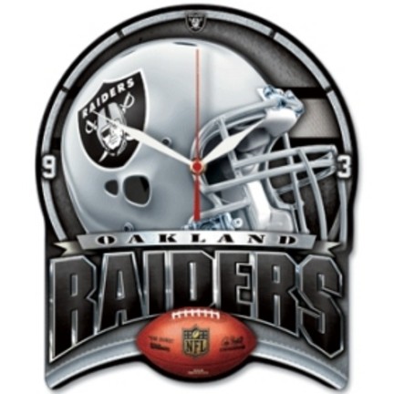 Officially licensed 10" x 12" size plaque style clock is uniquely shaped and has dynamic full color graphics with a durable matte finish and Oakland Raiders logo. The clock has a high quality quartz movement with a sweep second hand and includes 2 year life AA Alkaline battery.