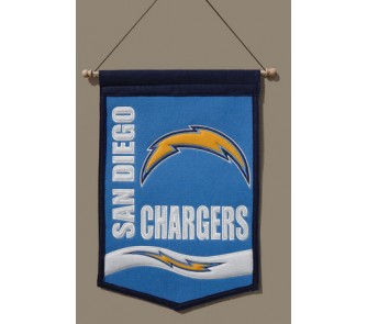 NFL Traditions banners constructed using wool and high quality embroidery and appliqué just like the pennants. Each banner comes ready to hang with a dowel rod and an attached cord. Each design reflects the San Diego Chargers' uniform design. The banner measures 12" W x 18" L.