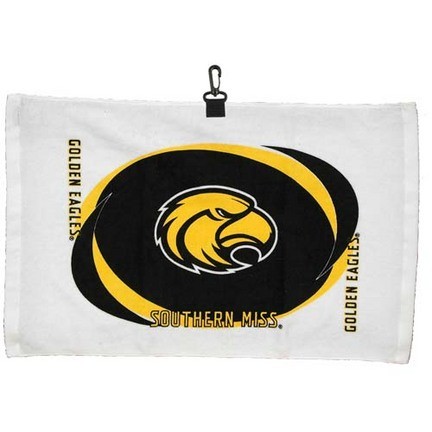 Printed 16" x 26" hemmed towels of standard weight made of durable 100% cotton features a centrally placed brass grommet and hook that allows for easy access and keeps the towel off the ground and is printed with the NCAA Southern Mississippi Golden Eagles logo.